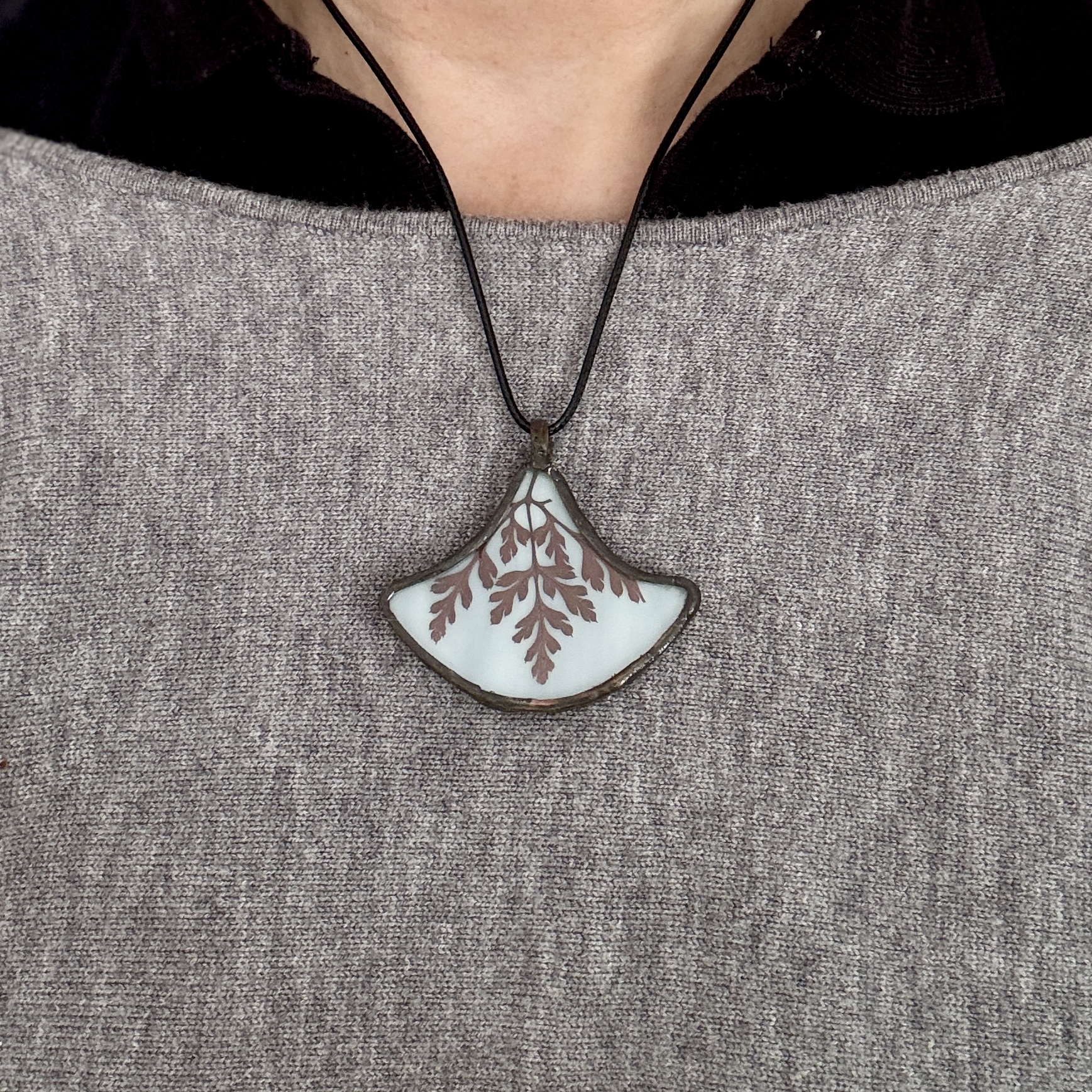 Delikatny szklany wisiorek w kolorze szarym o szerokości 5,5 cm, z zatopionymi w środku łodyżkami bodziszka. Subtelne połączenie naturalnego piękna i rękodzieła tworzy romantyczny, ponadczasowy akcent – idealny dla osób ceniących wyjątkową biżuterię inspirowaną naturą.
