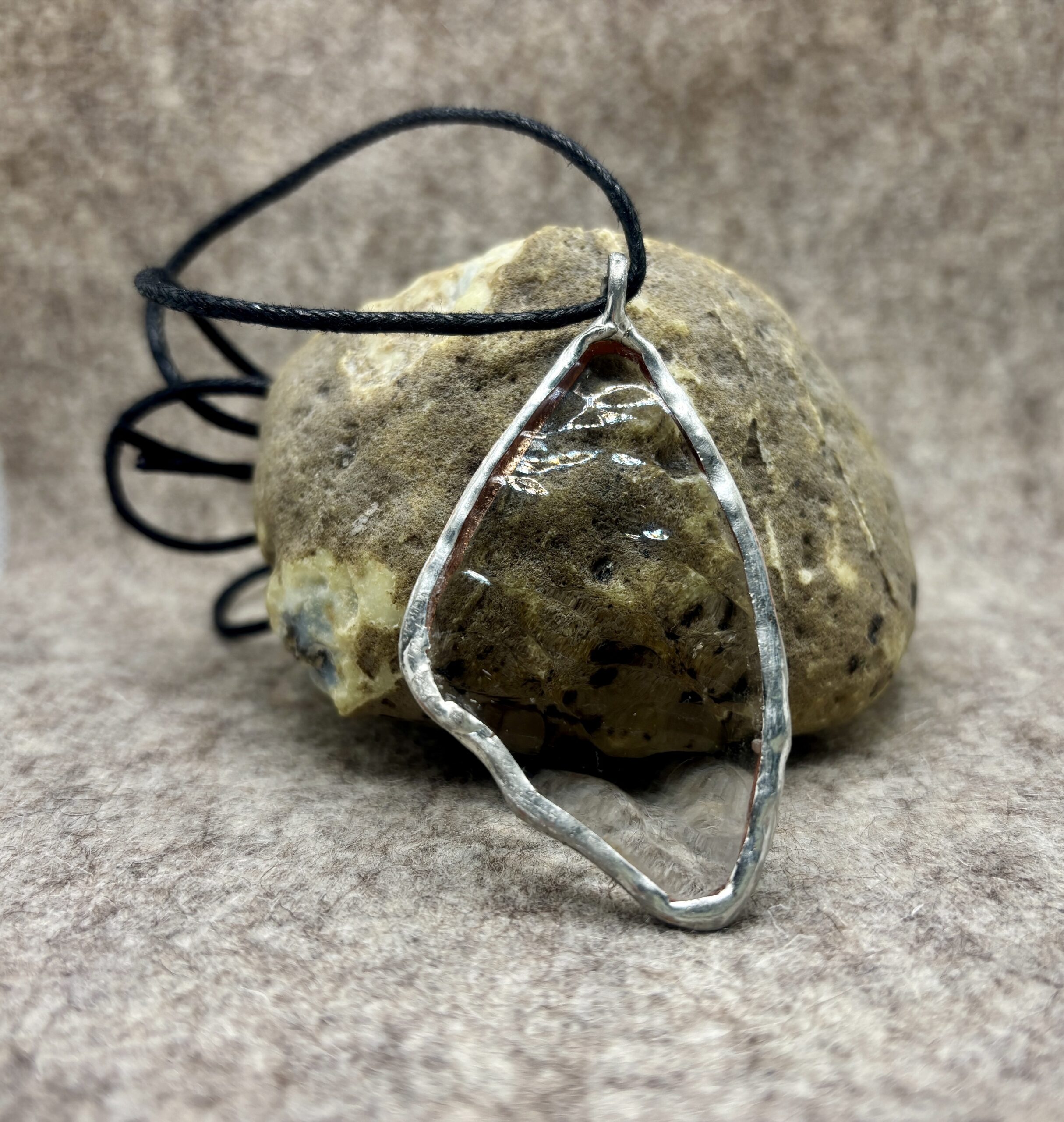 Ma asymetryczny, organiczny kształt, nieco przypominający skrzydełko motyla. Brzeg wisiorka obramowany cynowaną ramką, wykonaną ręcznie — widać charakterystyczne, nieregularne wykończenie lutu.
