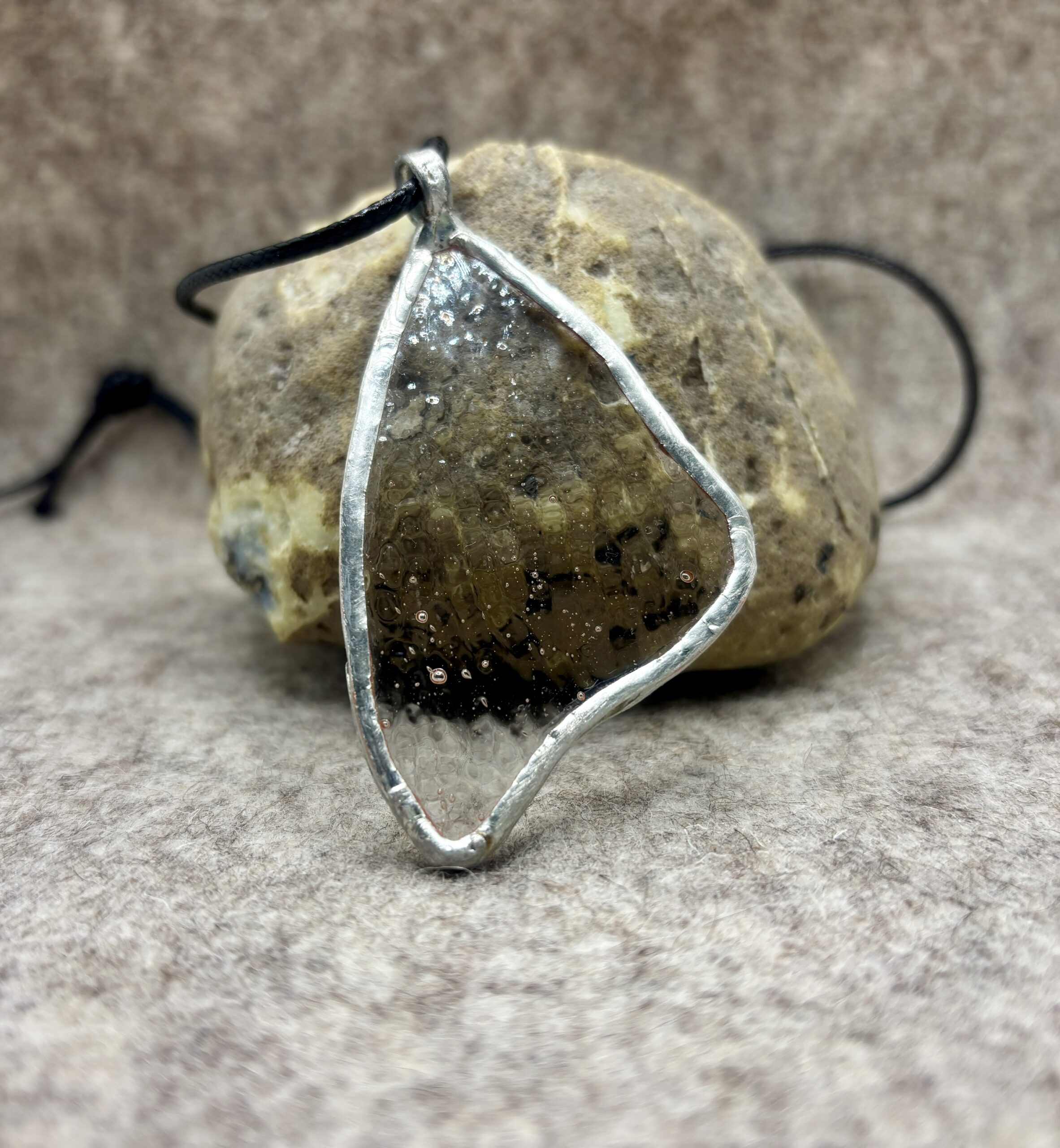 Ma asymetryczny, organiczny kształt, nieco przypominający skrzydełko motyla. Brzeg wisiorka obramowany cynowaną ramką, wykonaną ręcznie — widać charakterystyczne, nieregularne wykończenie lutu.