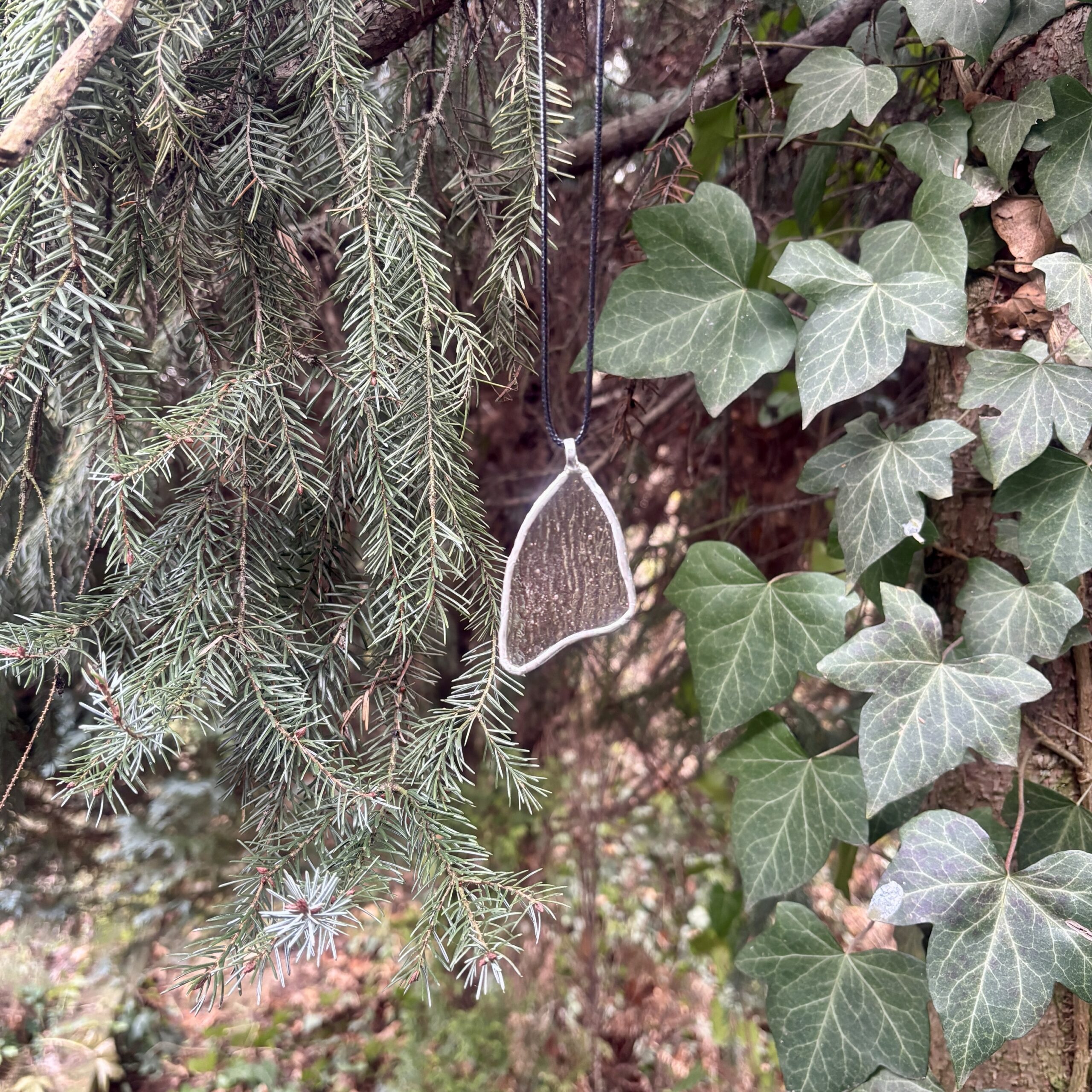 Szklany wisior o wymiarach około 7 × 4 cm, wykonany z przezroczystego, zmrożonego szkła. Ma asymetryczny, organiczny kształt, nieco przypominający skrzydełko motyla. Brzeg wisiorka obramowany cynowaną ramką, wykonaną ręcznie — widać charakterystyczne, nieregularne wykończenie lutu. Szkło przypomina lód, co tworzy wyraźny efekt świetlny: rysy łamią światło i nadają powierzchni dynamiczny, zimowy wygląd.