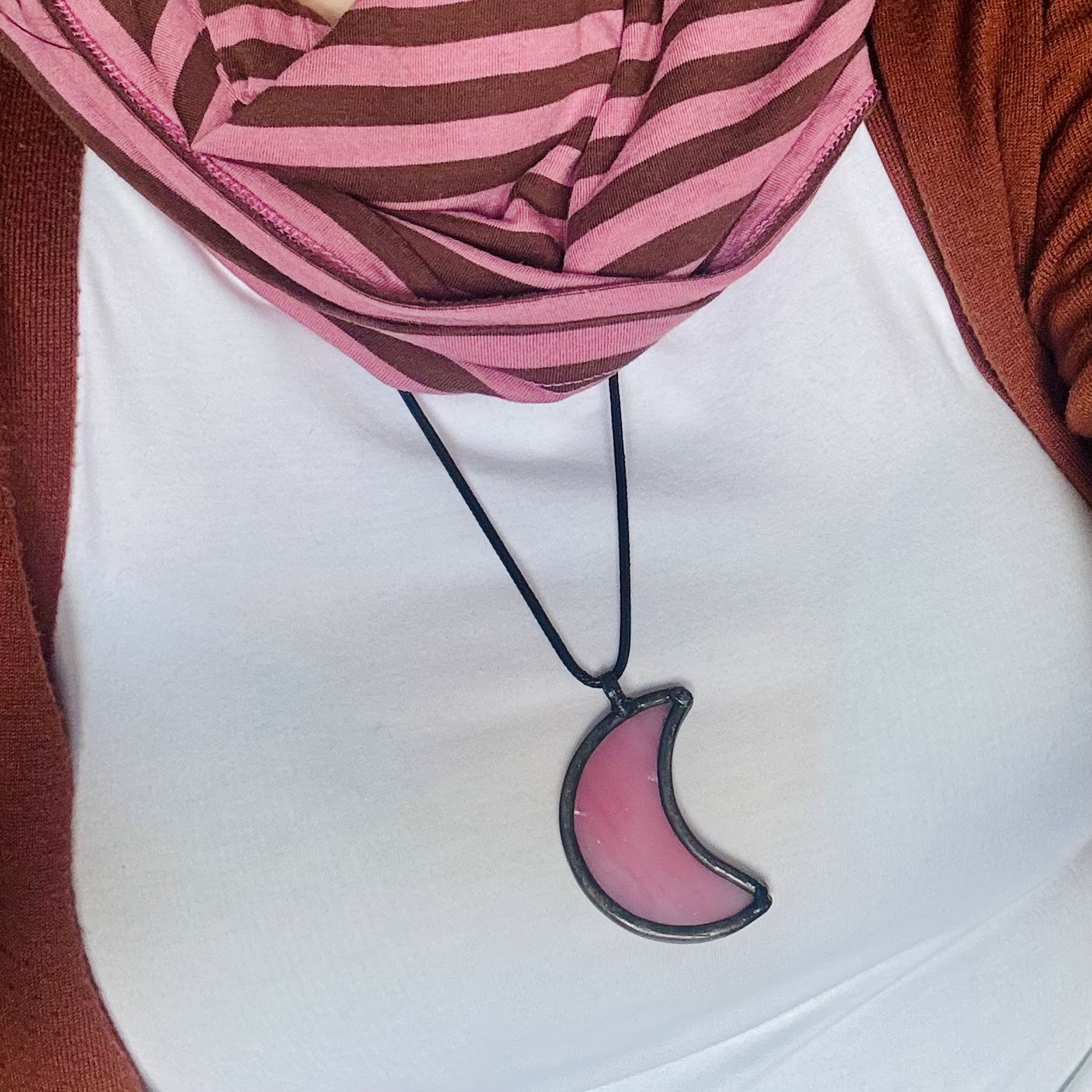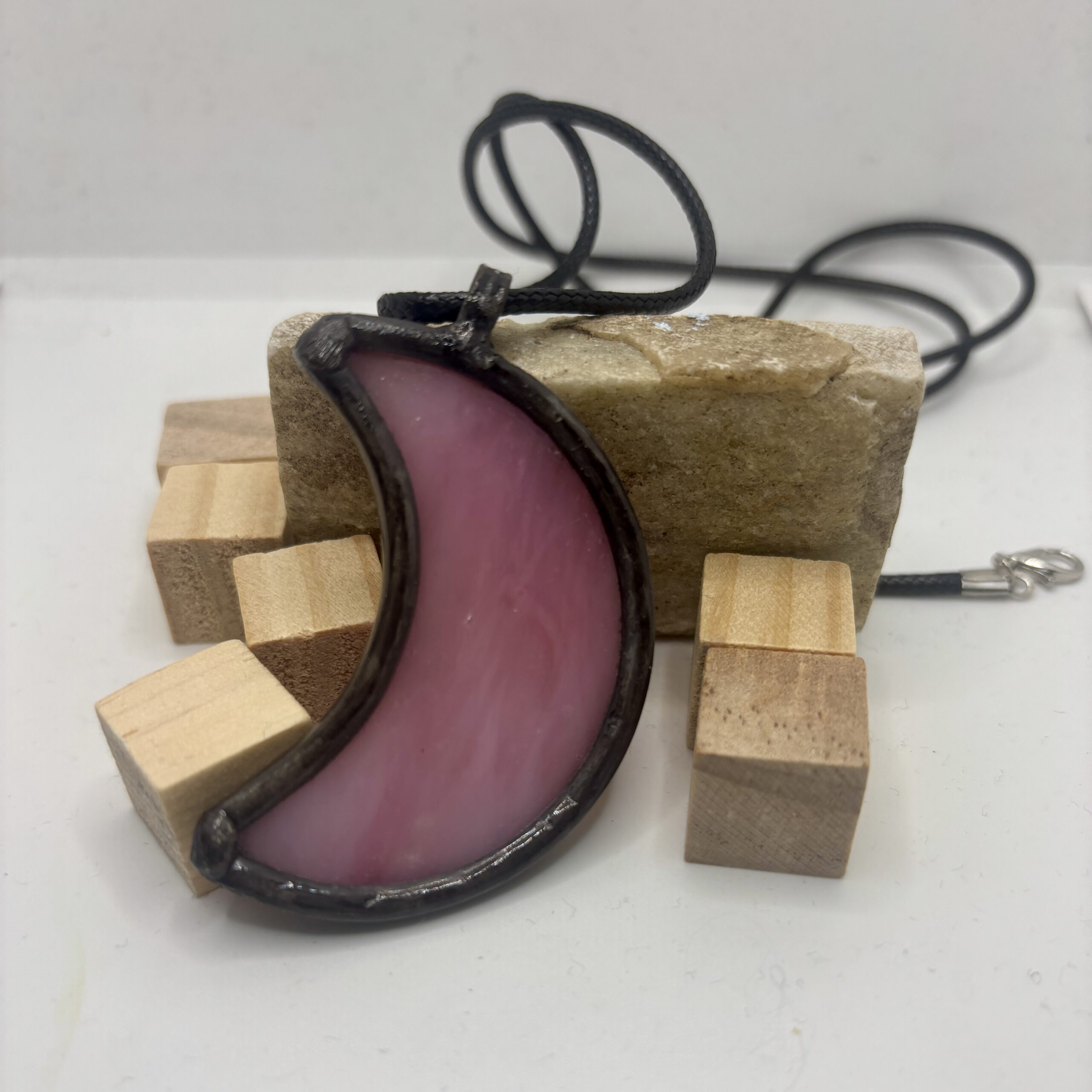 Romantyczny wisiorek półksiężyc z opalizującego różowego szkła. Delikatny i kobiecy, z nutą tajemnicy. Wysokość: 5,3 cm