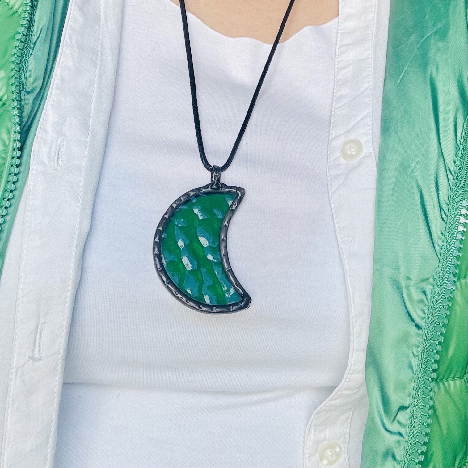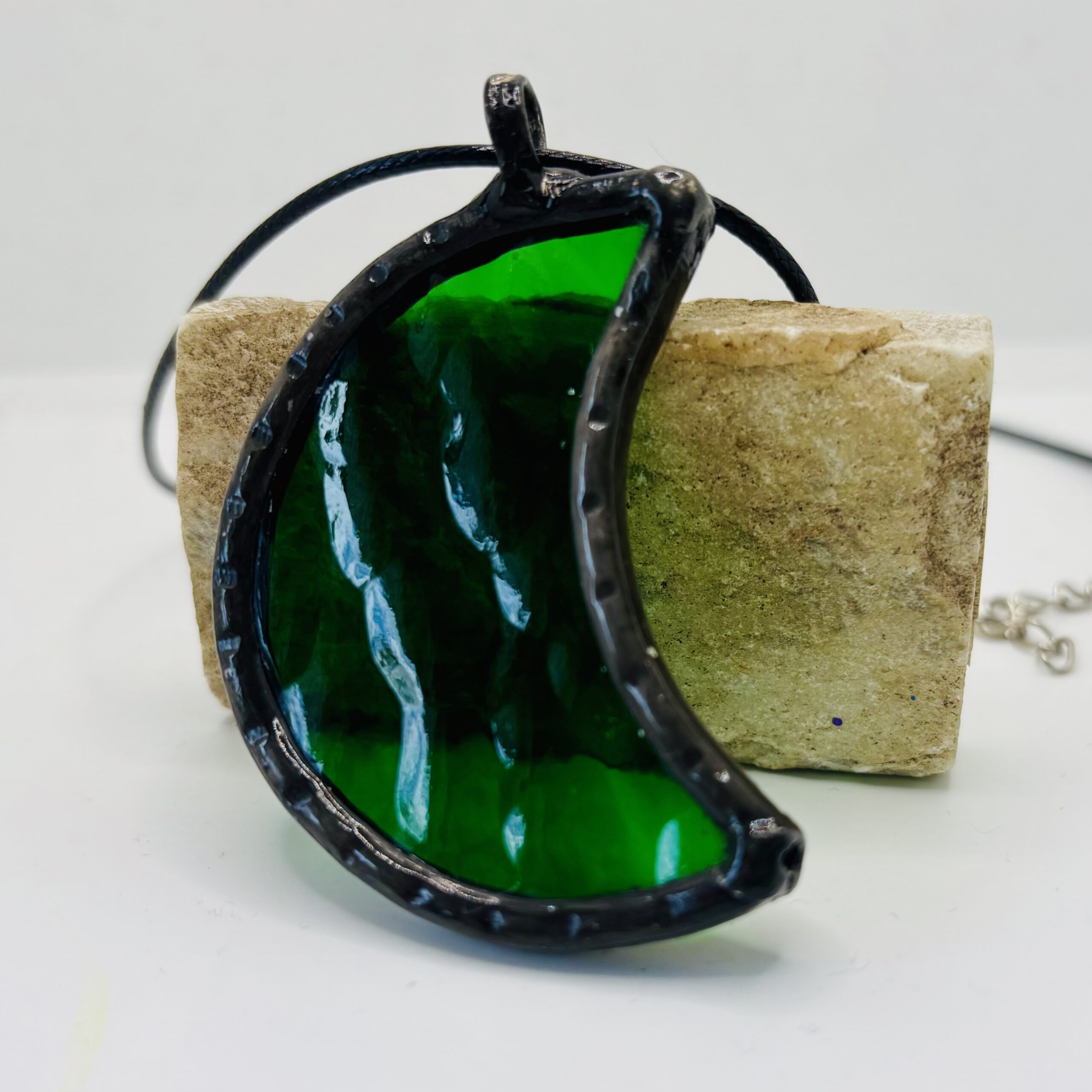 Szklany półksiężyc w głębokim, butelkowozielonym odcieniu – elegancki, tajemniczy i uziemiający. Dla tych, którzy szukają równowagi i bliskości z naturą.