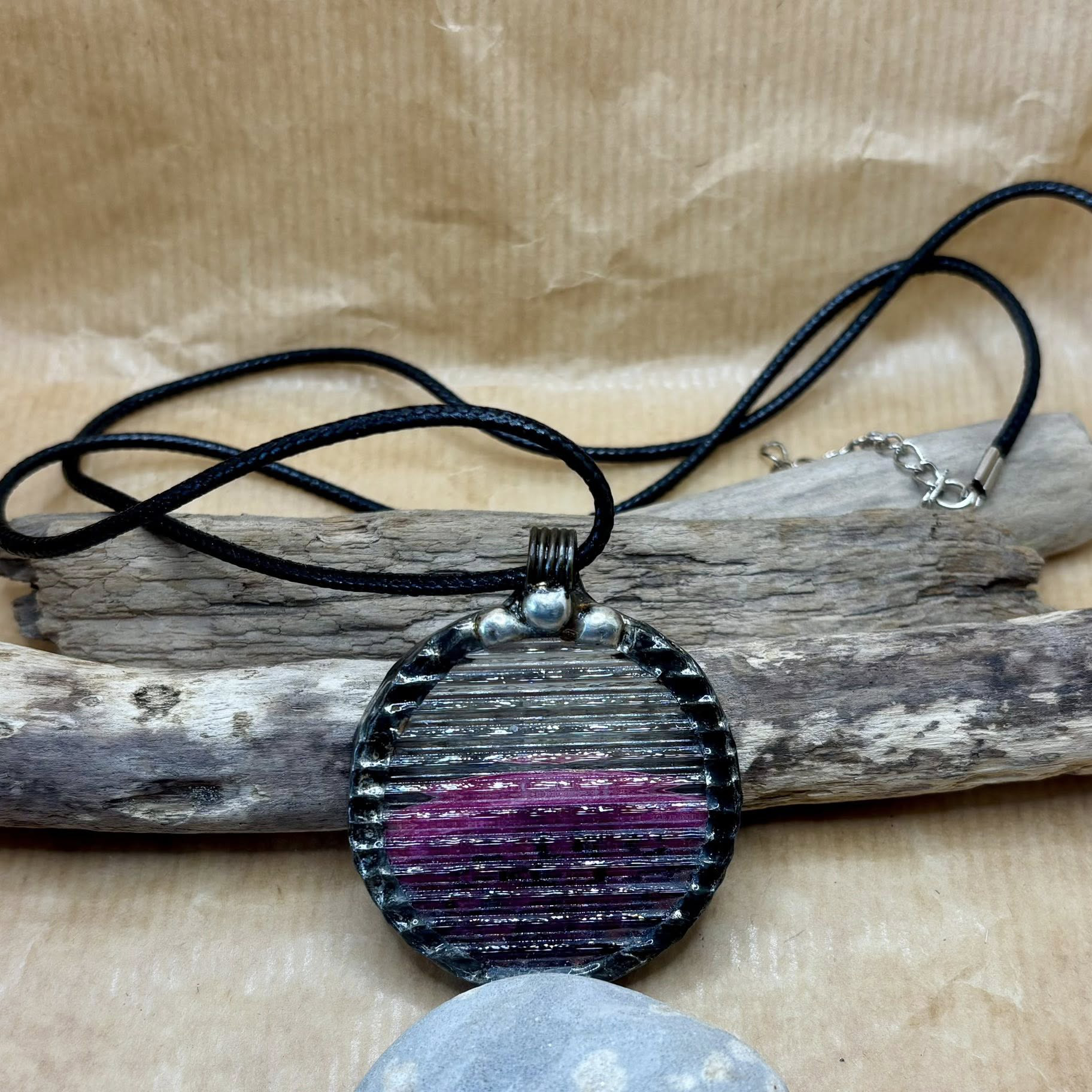 Szklany wisior z zasuszonym owocem pitai (dragon fruit) to unikalna ozdoba, łącząca w sobie naturalne piękno i delikatność szkła. Wewnątrz transparentnego krążka zatopiony został fragment suszonego owocu o intensywnie różowym kolorze i charakterystycznych czarnych nasionkach, tworząc efektowny, egzotyczny akcent. Każdy wisior jest ręcznie wykonany, dzięki czemu nie ma dwóch identycznych egzemplarzy — to wyjątkowy talizman natury zamknięty w szklanej formie.