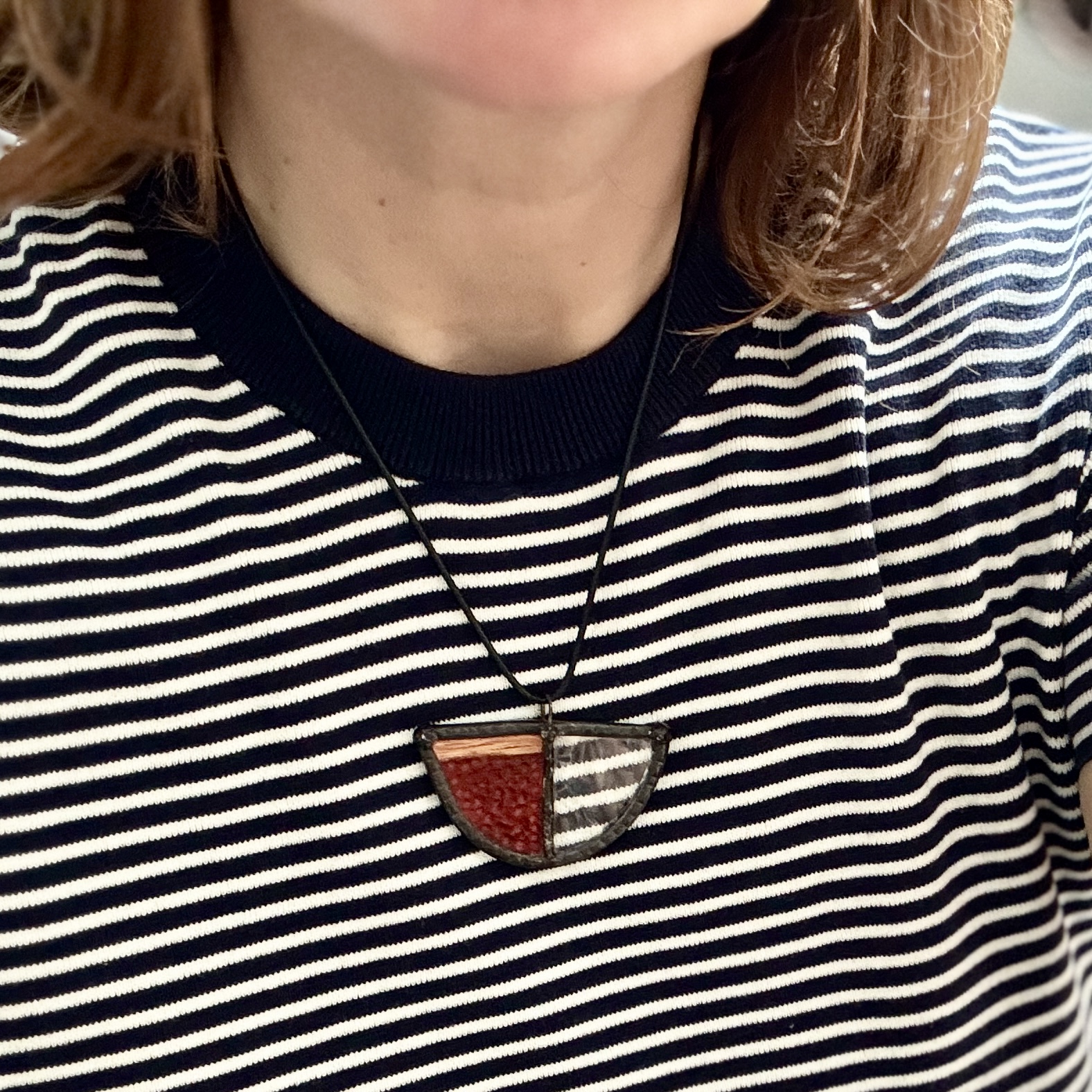 Wisiorek o unikalnym charakterze, wykonany z połączenia młotkowanego szkła i dwubarwnego drewna, zamkniętych w eleganckiej metalowej obwódce. Chłodna, falowana powierzchnia szkła subtelnie kontrastuje z ciepłem naturalnego drewna, tworząc harmonijną całość. Wisiorek ma szerokość 6 cm i wysokość 3,5 cm – idealny jako wyrazisty, ale stonowany akcent do codziennej lub artystycznej stylizacji.