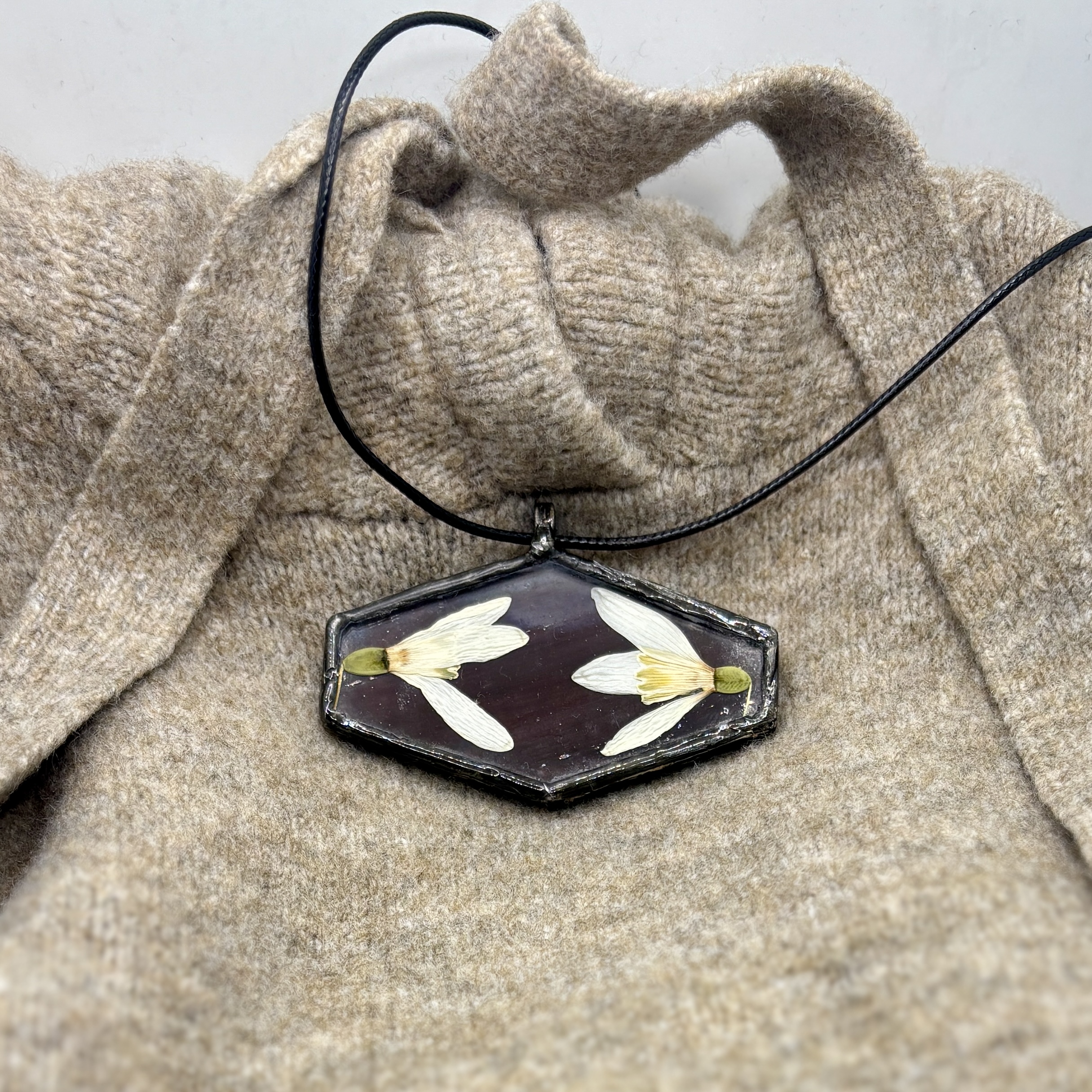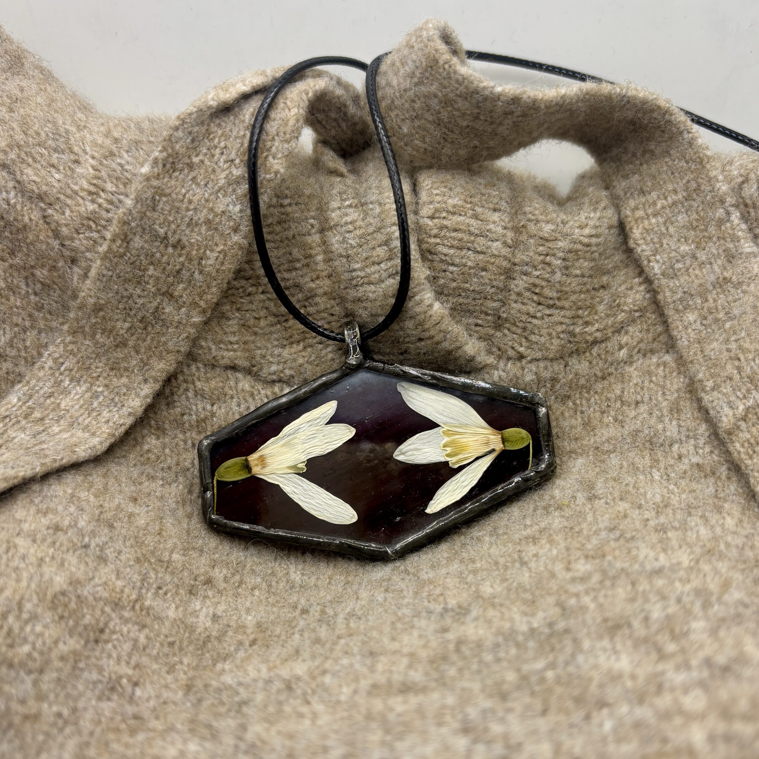 Unikatowy wisiorek wykonany z bordowego szkła. Wewnątrz zatopione zostały dwa ogrodowe przebiśniegi.  Wisiorek ma oryginalny kształt o wymiarach 6,5 cm szerokości i 3,5 cm wysokości. Doskonale sprawdzi się jako przyciągający uwagę akcent codziennej stylizacji lub wyjątkowy dodatek do bardziej eleganckiego stroju. Idealny dla miłośników natury i niepowtarzalnej biżuterii rękodzielniczej.