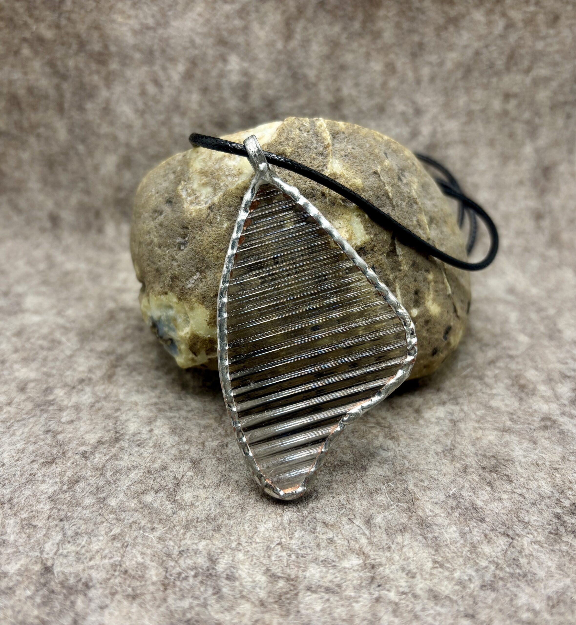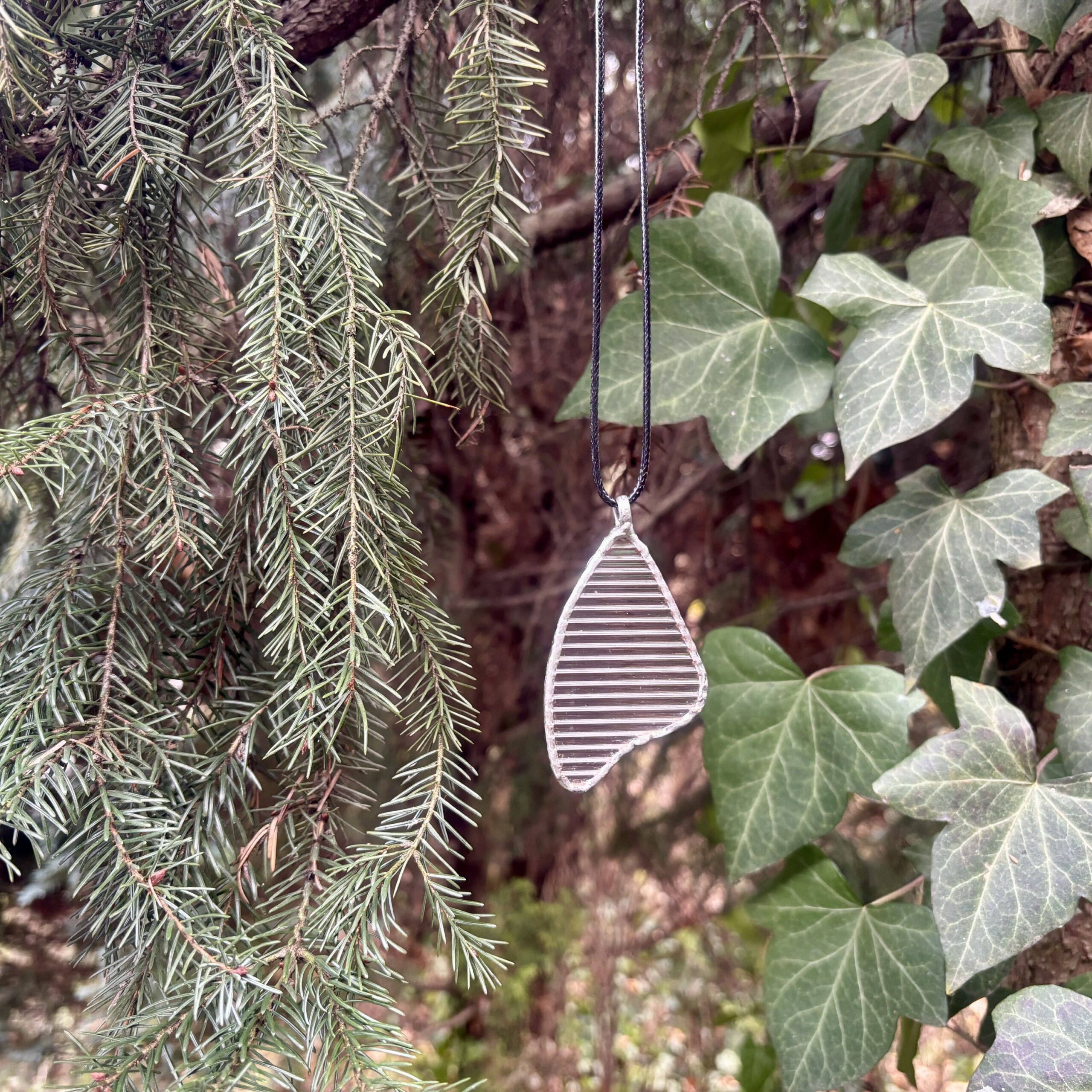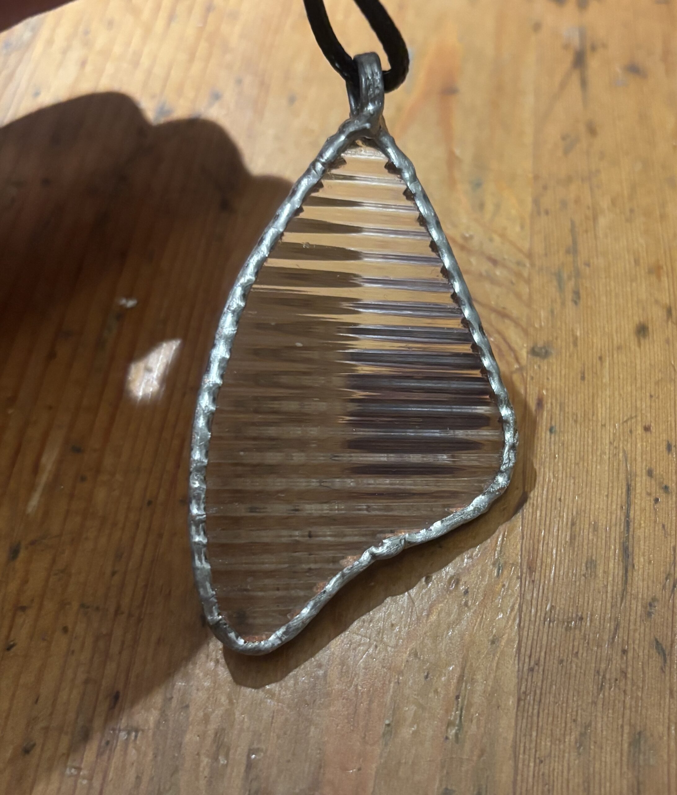 To szklany wisior o wymiarach około 7 × 4 cm, wykonany z przezroczystego, żłobionego szkła. Ma asymetryczny, organiczny kształt, nieco przypominający skrzydełko motyla. Brzeg wisiorka obramowany cynowaną ramką, wykonaną ręcznie — widać charakterystyczne, nieregularne wykończenie lutu. Szkło jest poziomo ryflowane, co tworzy wyraźny efekt świetlny: rysy łamią światło i nadają powierzchni dynamiczny, prążkowany wygląd.