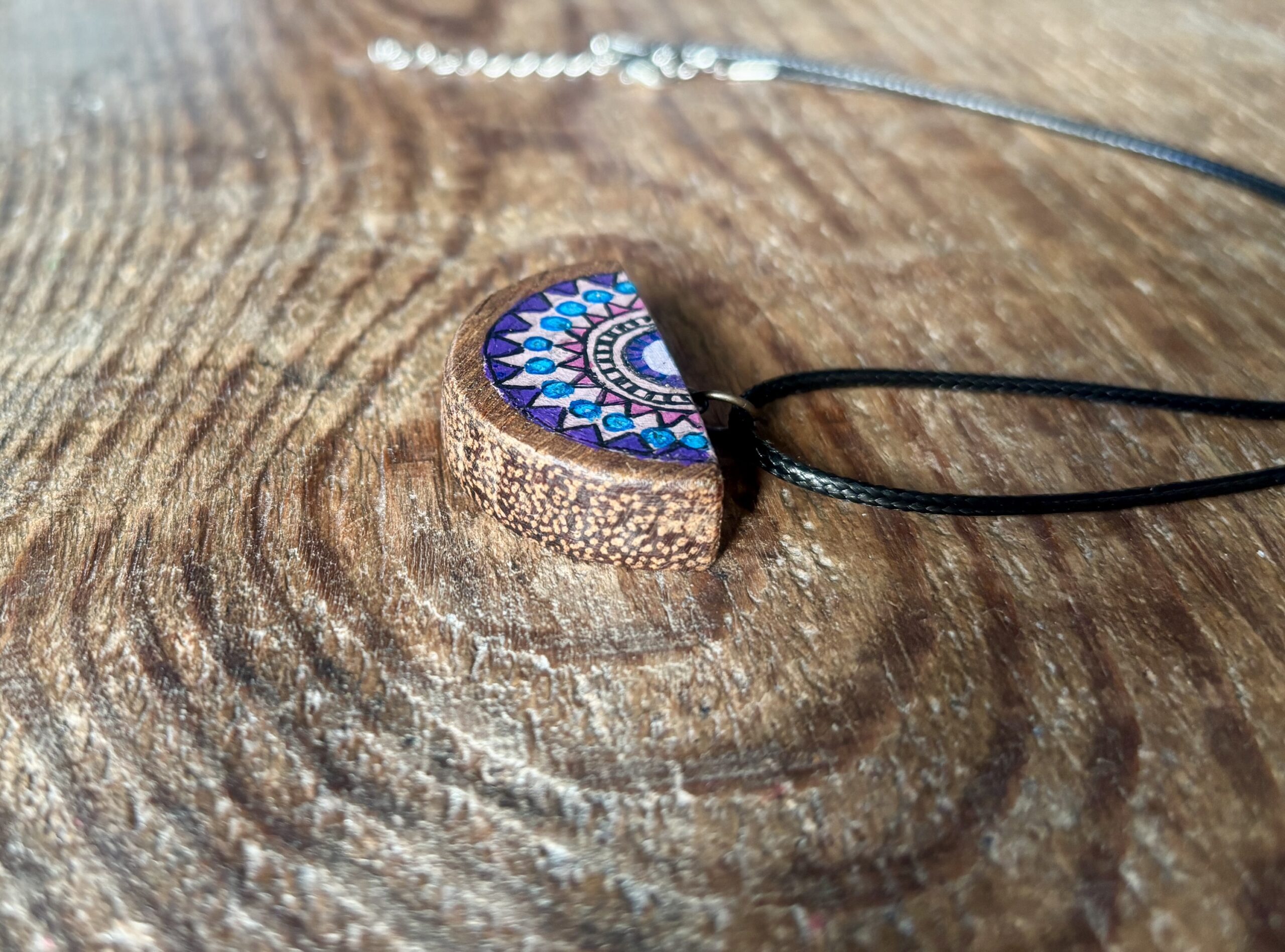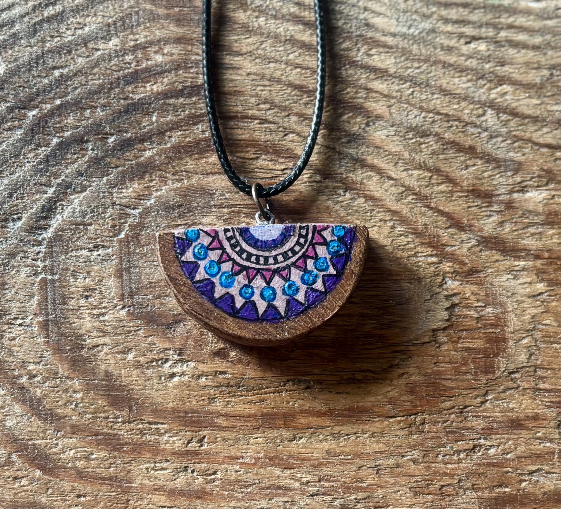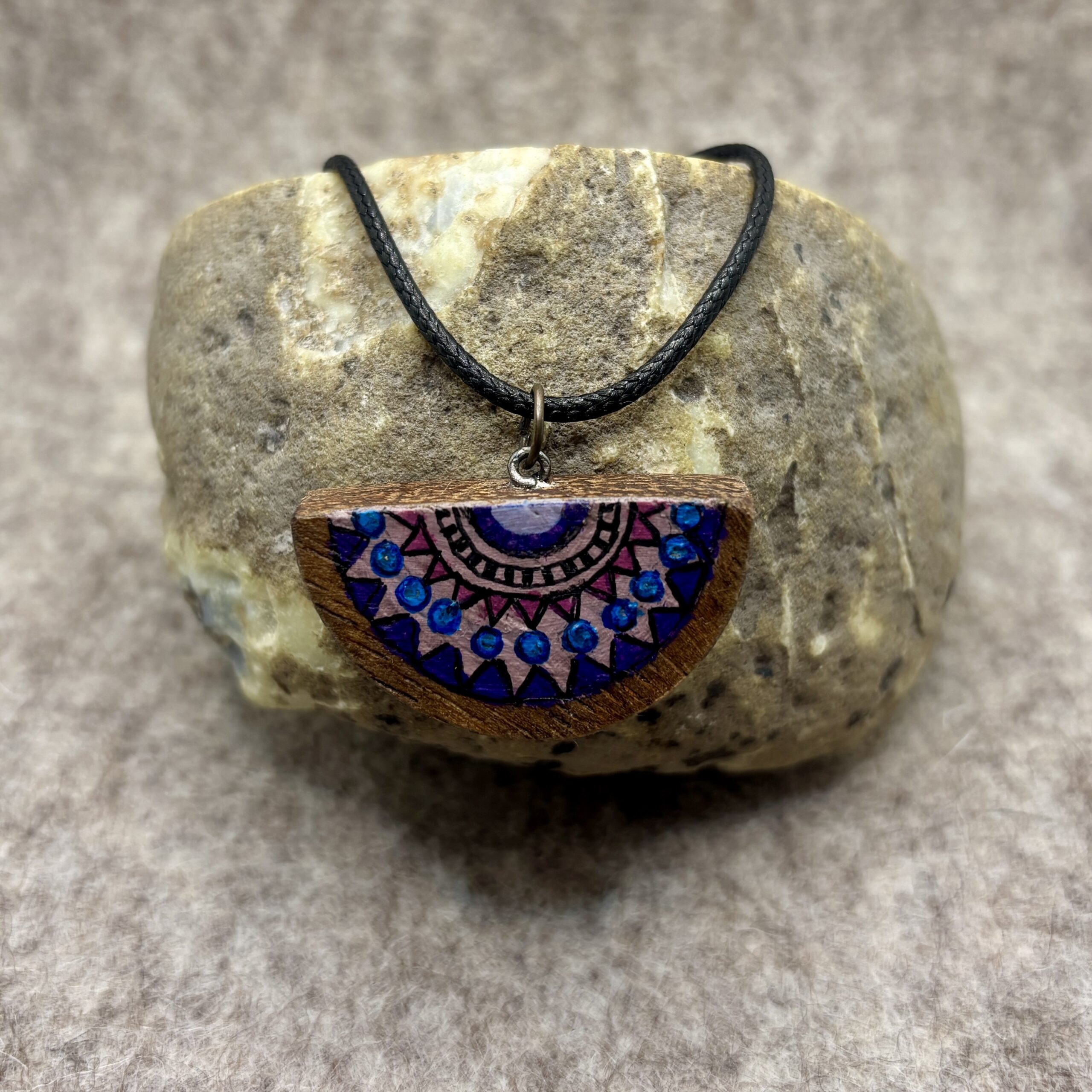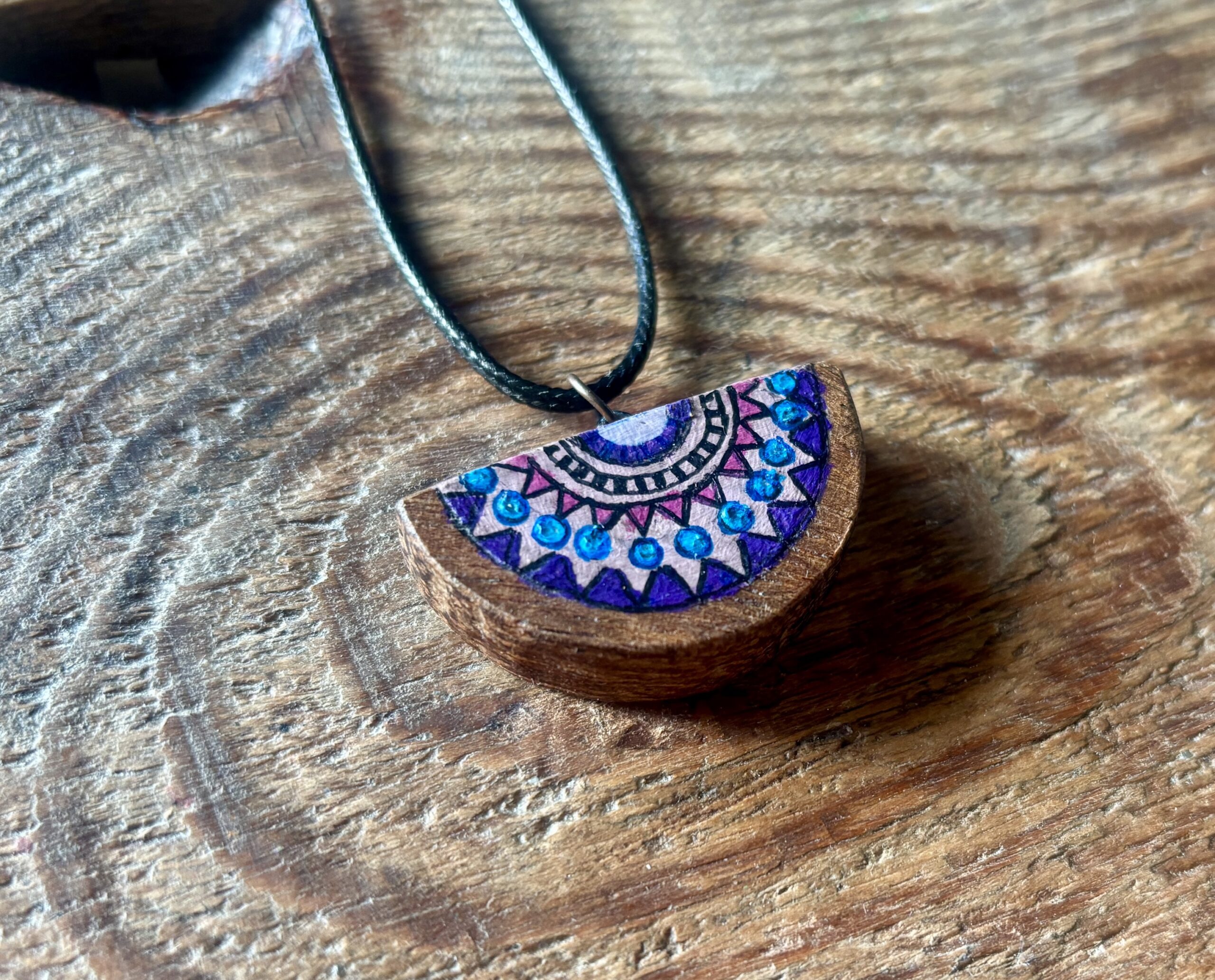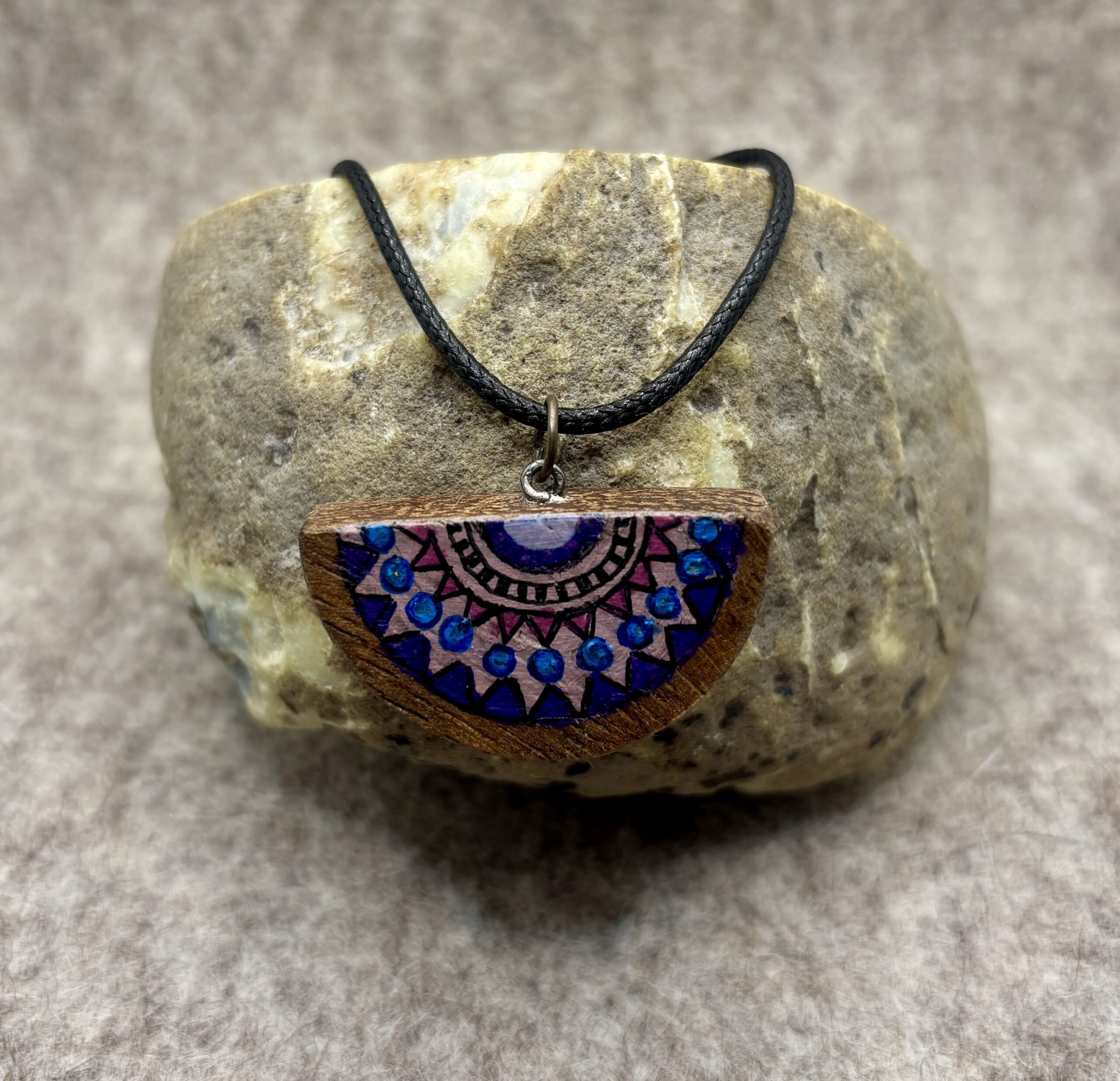 Drewniany, lekki wisiorek z rysunkiem przypominającym wzór skandynawskiego, wełnianego swetra. Malowany farbami akrylowymi w tonacjach fioletu z niebieskimi akcentami. Zabezpieczony lakierem i woskiem.