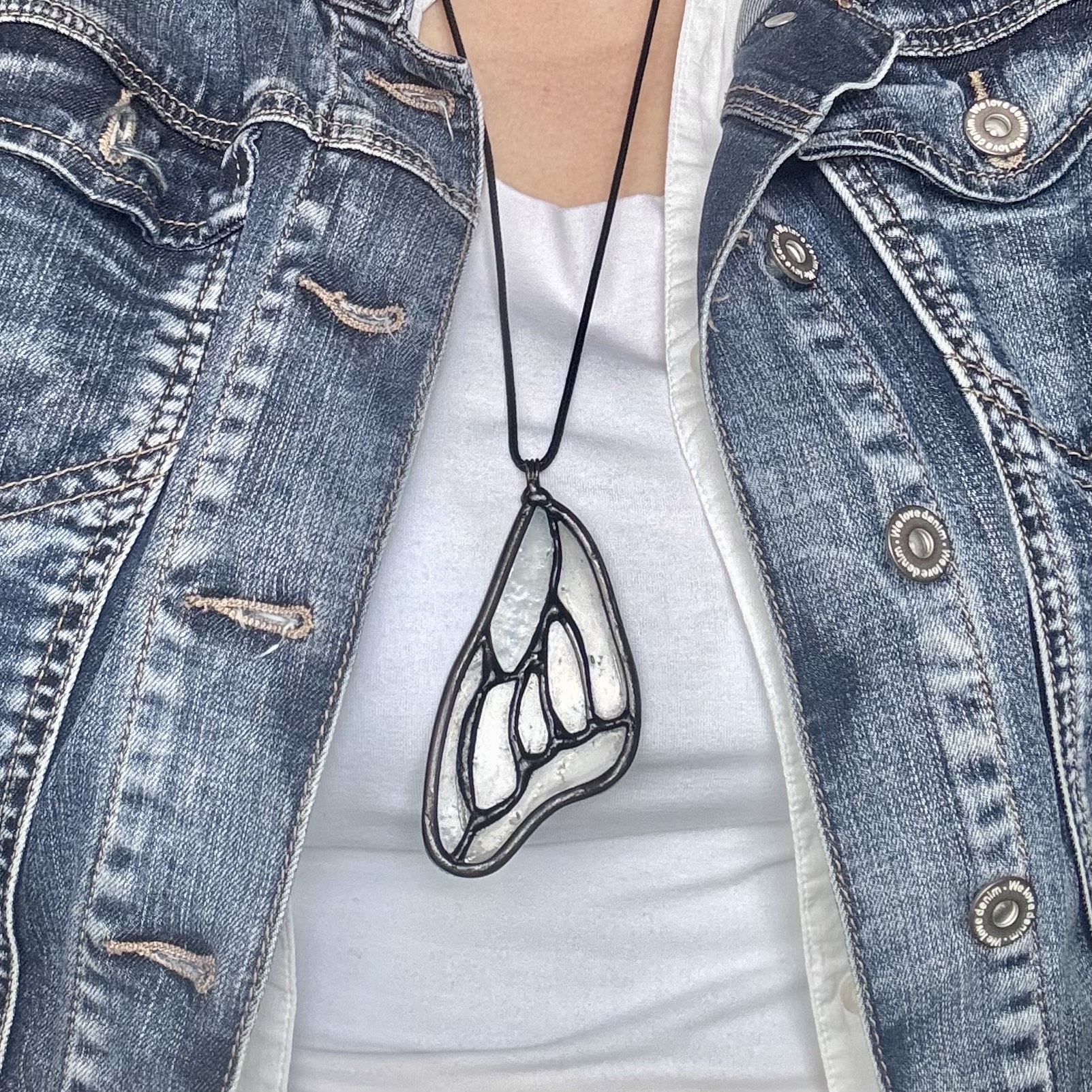 Szklany wisiorek w kształcie skrzydełka owada zachwyca subtelną formą. Utrzymany w tonacji złamanej bieli i jasnym popielu. Wysokość wisiorka to 8,5 cm – idealna, by przyciągać wzrok, a jednocześnie pozostawać lekkim i delikatnym dodatkiem. Unikalny, ręcznie wykonany element biżuterii inspirowany naturą.